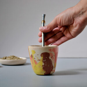 Bellísimos mates de cerámica artesanal o si querés, tacita para el café también. Incluye bombilla de regalo. Únicos, su forma simple da lugar a que se luzca el efecto de la mezcla fluida de las arcillas coloreadas, el color es dado por arcillas y no por esmaltes.