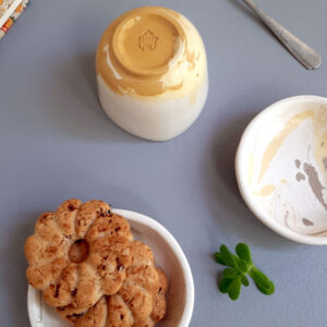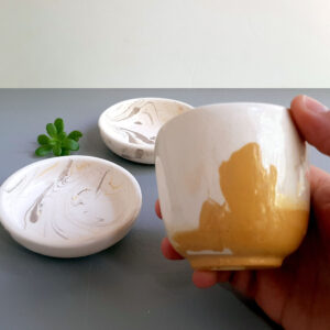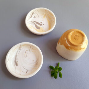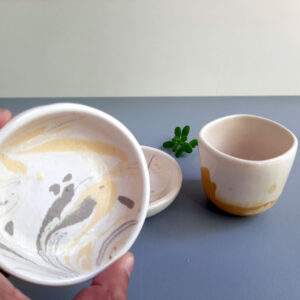 Bellísimo set de Tacita y dos platitos de cerámica artesanal, únicos, su forma simple da lugar a que se luzca el efecto de la mezcla fluida de las arcillas coloreadas, el color es dado por arcillas y no por esmaltes.